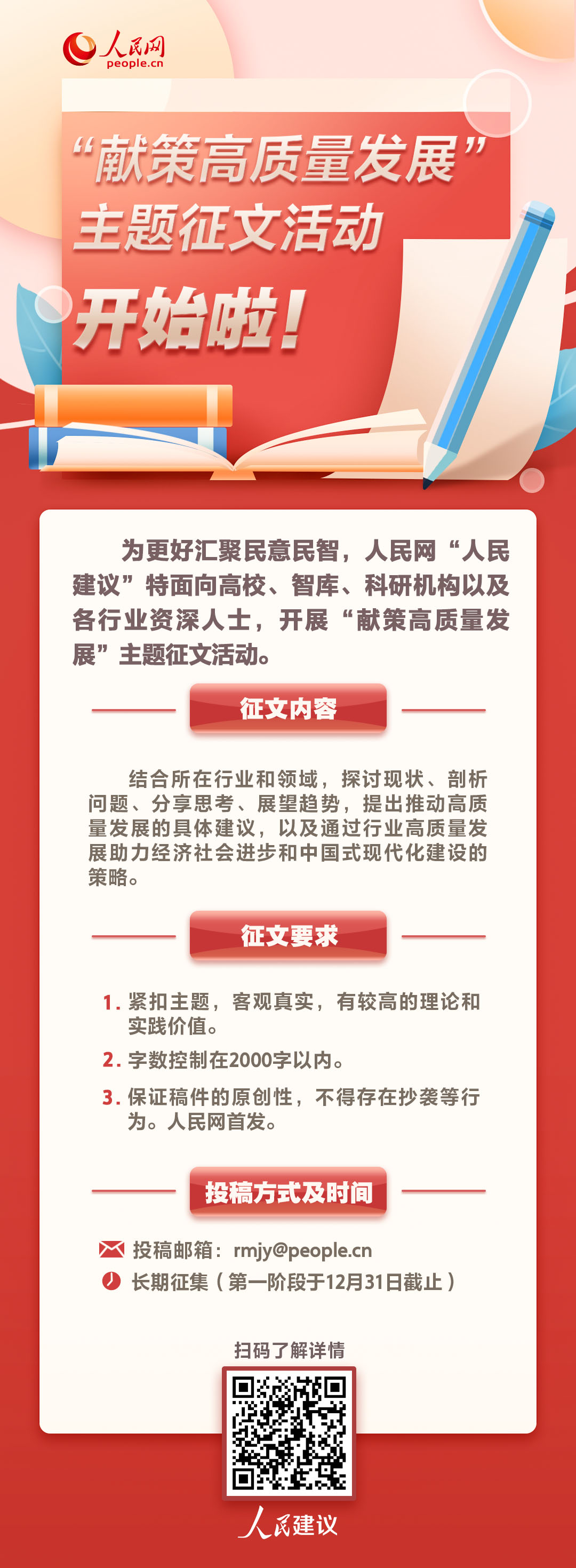 即日起,人民網(wǎng)“人民建議”開設(shè)“人民建議·獻(xiàn)策”專欄,刊載優(yōu)秀征文。